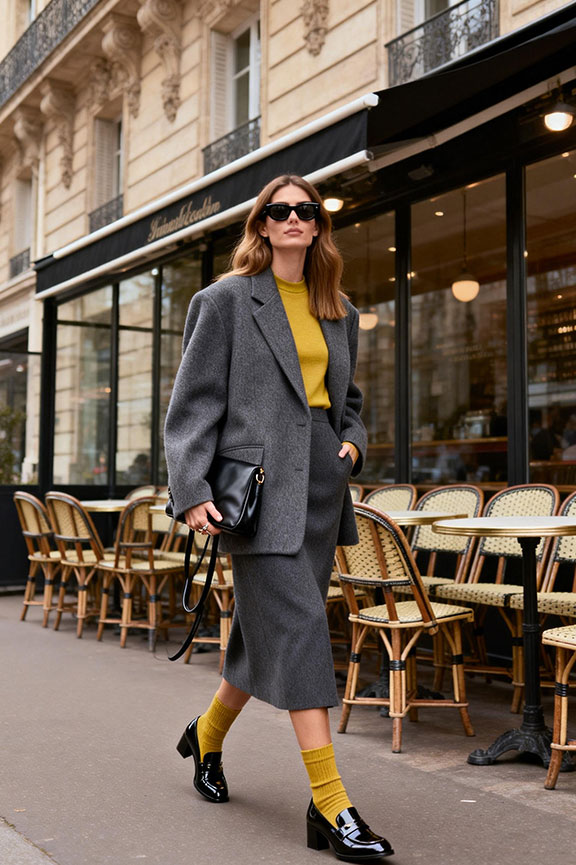 The grey oversized blazer adds structure without feeling stiff, making it easy to layer over a simple base. A mustard yellow top brings warmth and contrast, breaking up the grey tones and adding interest without overpowering the look. The grey straight skirt keeps the outfit clean and elongated, while black loafers make it comfortable enough for walking or commuting. Finished with a black leather bag, this outfit works well for casual office days, meetings, or city outings when you want something polished but not overly formal.