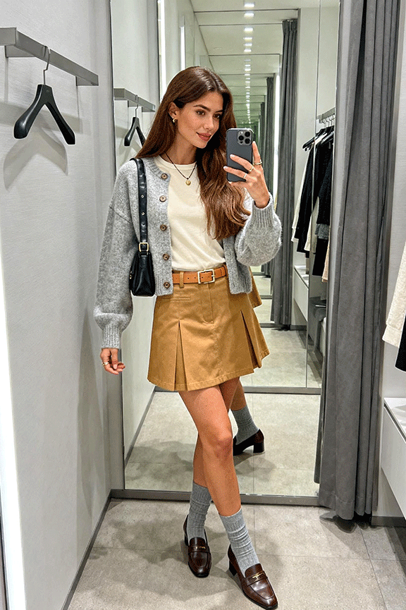 The grey knit cardigan layered over a white tee keeps the look soft and easy, adding warmth without feeling bulky. A-line skirt brings in subtle structure, balancing the casual knit with something more refined. Loafers paired with dark grey crew socks ground the outfit and make it comfortable enough for walking, while still looking intentional. This outfit works well for casual office days, gallery visits, or relaxed city outings when you want polish without effort.