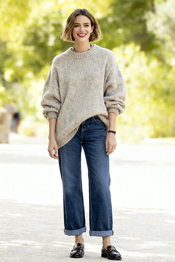 An oversized sweater softens the look and makes it feel lived-in. Straight jeans keep the proportions balanced, while loafers prevent the outfit from looking sloppy. Great for cooler days when you want warmth without layering too much.