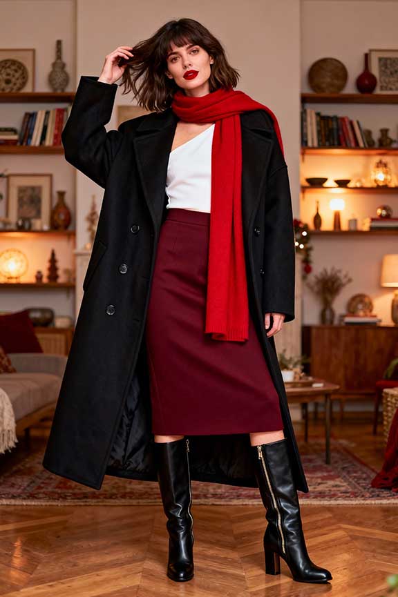 A black extra-long coat instantly adds drama and structure, creating a strong, elongated silhouette. The red scarf becomes the focal point, bringing warmth and a bold pop of color that lifts the entire look. A white off-shoulder top softens the outfit with a subtle hint of femininity, while the printed midi skirt adds movement and visual interest. Finished with black knee-high boots, this outfit feels polished yet expressive—perfect for winter days when you want to stand out without overdoing it.
