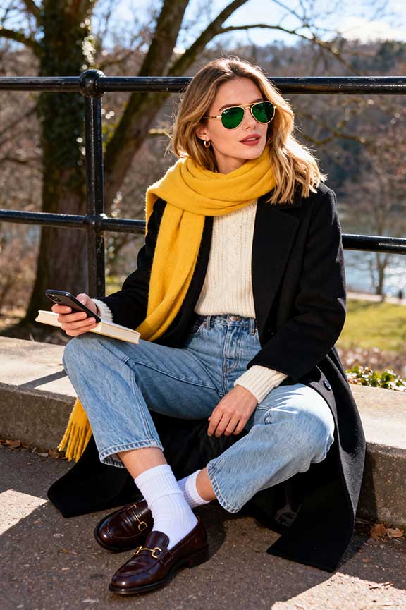 A black long coat paired with a cream sweater creates a soft, balanced winter look. Light blue jeans keep the outfit relaxed and easy to wear. The yellow scarf adds a pop of color, instantly brightening the neutral base. Brown loafers with white socks bring a classic, slightly preppy touch. Finished with Ray-Ban sunglasses, this outfit feels effortless, cheerful, and perfectly suited for everyday winter styling.