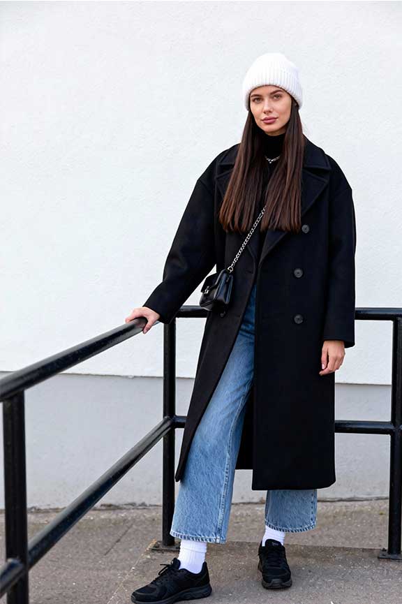 An oversized black long coat instantly gives the outfit a relaxed, effortless structure. Light blue jeans soften the look and keep it casual and wearable. The white knit beanie and white socks create a clean, cohesive color flow, while sporty shoes add an unexpected, fashion-forward twist.