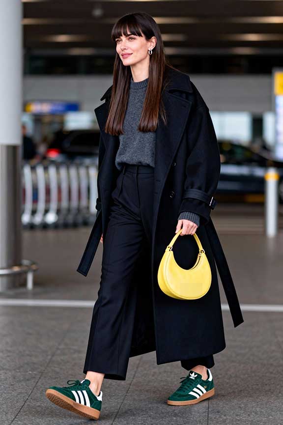 A black tie-waist coat creates a clean, elongated silhouette while subtly defining the waist, keeping the look sharp but relaxed. The dark grey sweater softens the outfit and adds depth without breaking the neutral palette. Black wide-leg pants balance the structured coat with an effortless, modern drape that feels comfortable for all-day wear. Dark green sneakers introduce a sporty, unexpected contrast that keeps the outfit from feeling too formal. A yellow shoulder bag adds a pop of color, instantly making the look feel fresh, confident, and city-ready.