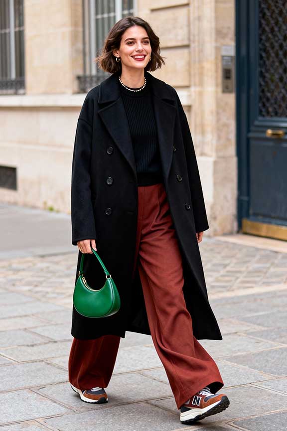 A chunky knit introduces texture and warmth to the outfit. Wide-leg pants add a modern, relaxed silhouette that balances the coat’s structure. The combination feels comfortable yet intentional. Stick to neutral tones to keep the look cohesive.