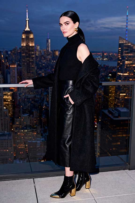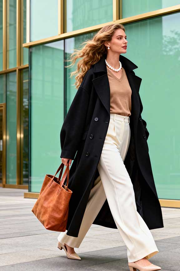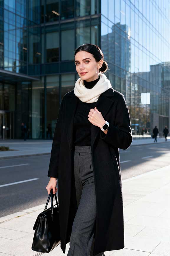 A fitted turtleneck keeps the look streamlined and refined. Tailored trousers add a professional touch while balancing the coat’s length. This pairing feels intentional and polished without being overly formal. Neutral accessories help maintain a clean, work-ready aesthetic.
