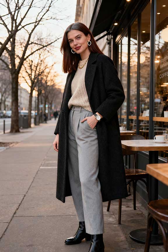 A grey sweater lightens the outfit while staying within a neutral palette. Black jeans maintain continuity and keep the look streamlined. The coat adds polish without overpowering the softer tones. This is a reliable everyday combination that feels understated yet stylish.
