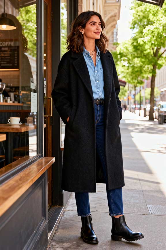 Layering denim pieces creates a casual, modern foundation. The black coat elevates the denim, preventing it from feeling too relaxed. Mixing denim washes adds subtle depth. This is an easy way to balance classic and contemporary styling.