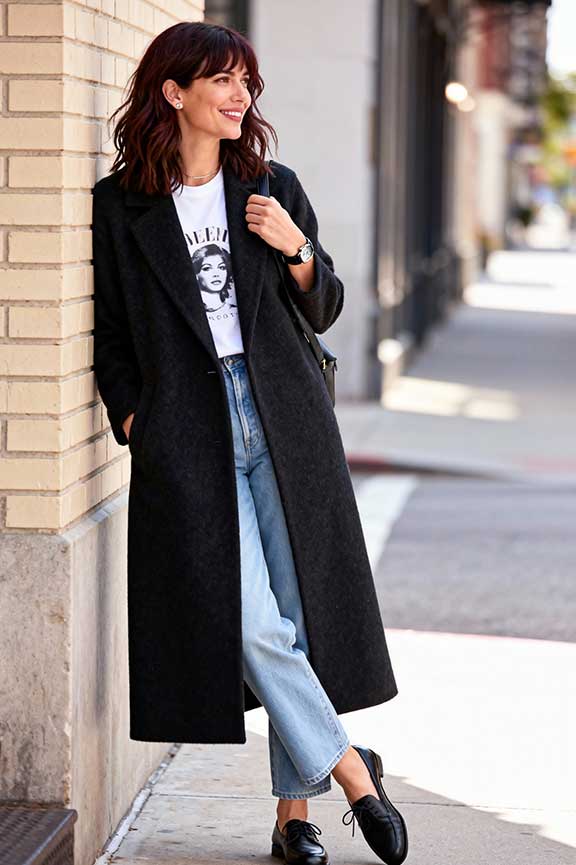 A graphic tee adds personality and a relaxed edge. Straight jeans keep the outfit balanced and wearable. The coat elevates the casual base into something more intentional. Let the graphic be the focal point while keeping accessories minimal.