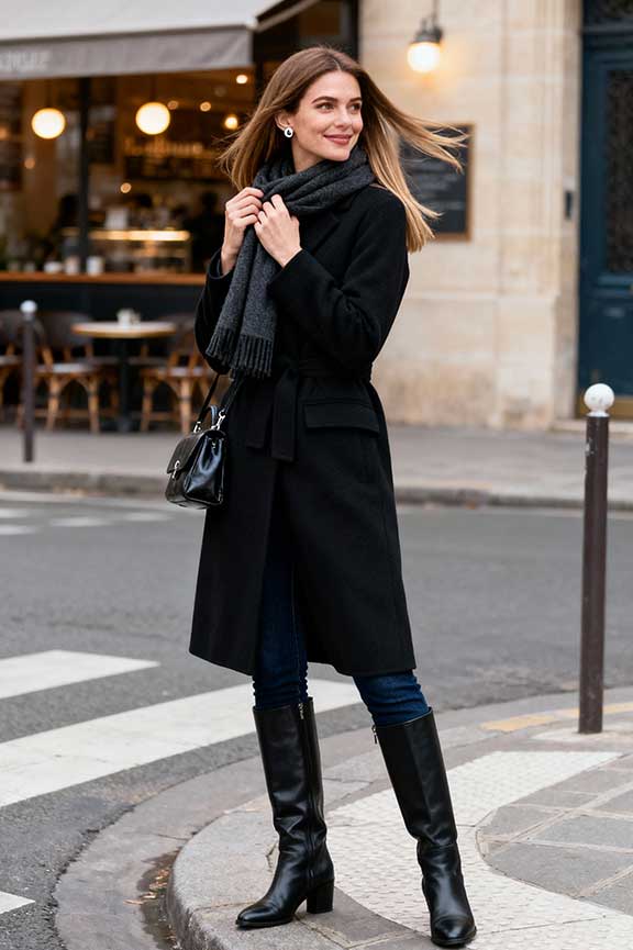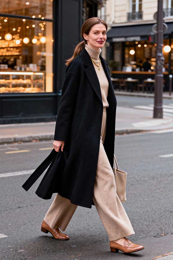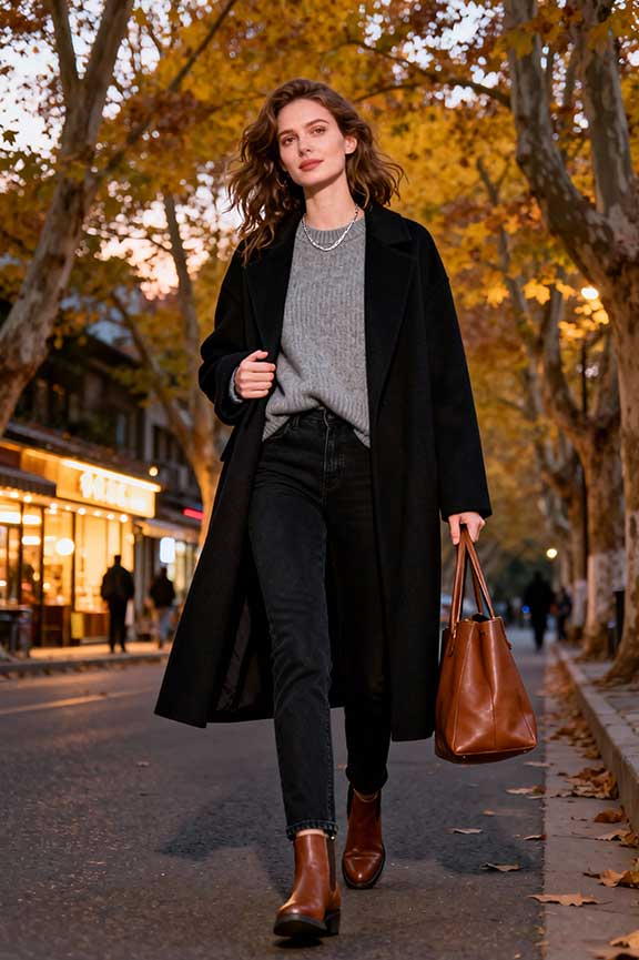 An all-black base instantly elongates the silhouette and feels effortlessly sophisticated. Mixing textures like wool, knit, and leather prevents the look from feeling flat. The long coat ties everything together with clean lines. This outfit works especially well for evenings or sleek city styling.