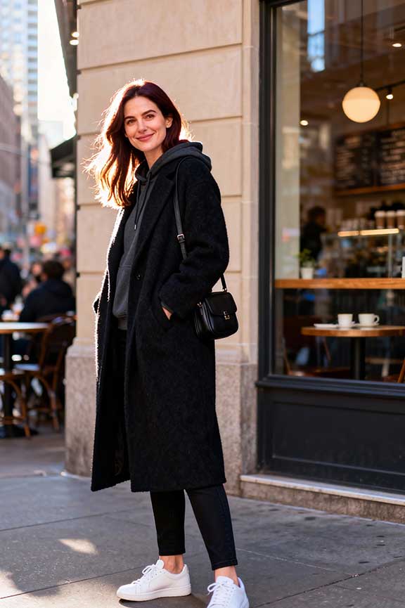 Layering a hoodie under a long black coat creates an effortless high-low contrast. Sneakers keep the outfit comfortable and practical for daily wear. The coat elevates the casual base, making it feel styled rather than sloppy. This look is ideal for travel days or relaxed weekends.