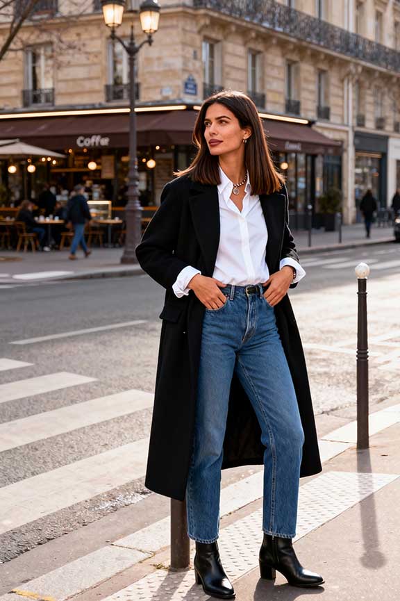 A crisp white shirt adds structure and brightness to the outfit. Blue jeans keep the look grounded and approachable. The black coat sharpens the overall appearance without making it too formal. This is an easy everyday option that always looks put together.