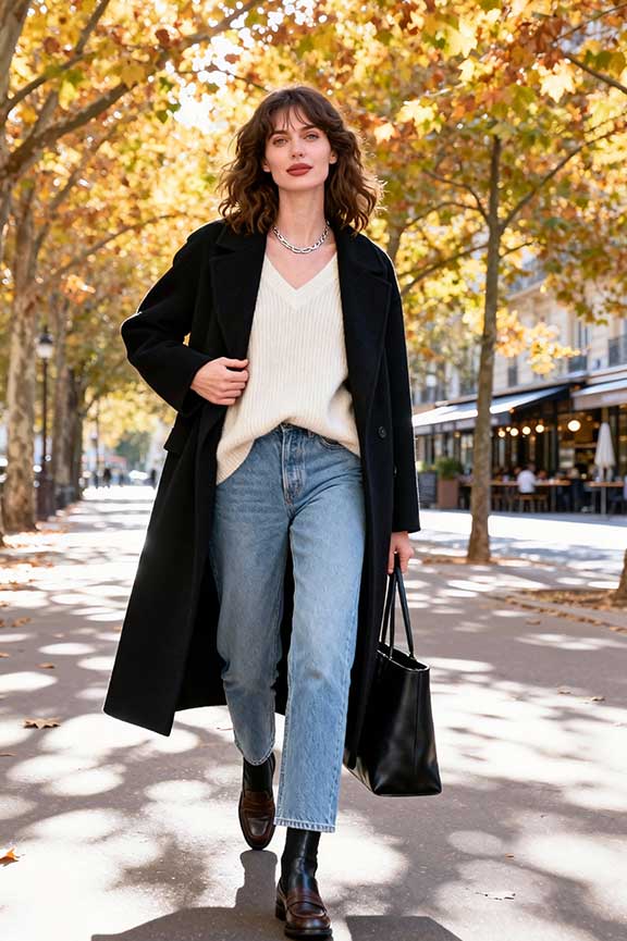 A white knit sweater creates a crisp contrast against the black coat, keeping the outfit fresh and balanced. Straight-leg jeans add structure without feeling too rigid. This combination feels classic and easy, perfect for everyday wear. Finish with ankle boots or loafers to maintain a polished yet relaxed look.