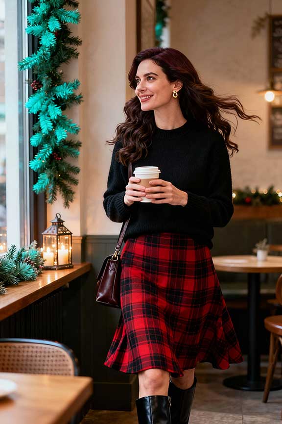 A black cashmere sweater paired with a plaid skirt offers a refined yet casual holiday look. The knee-high boots add warmth and sophistication, making it ideal for a casual holiday gathering or a Christmas lunch with friends.