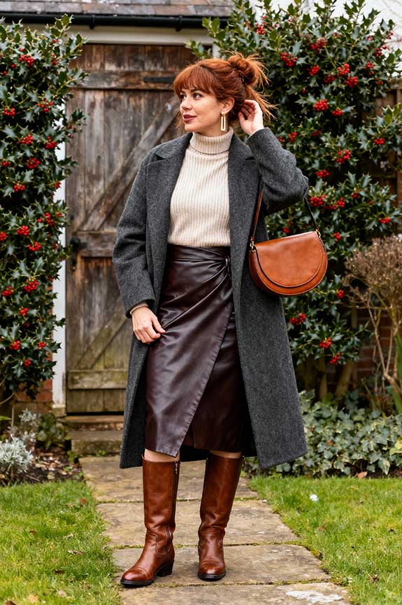 A leather midi skirt absolutely works in an Old Money wardrobe when styled with timeless companions. Clean silhouettes let the leather skirt feel luxurious rather than loud, creating a winter look that feels festive in restraint, not excess.