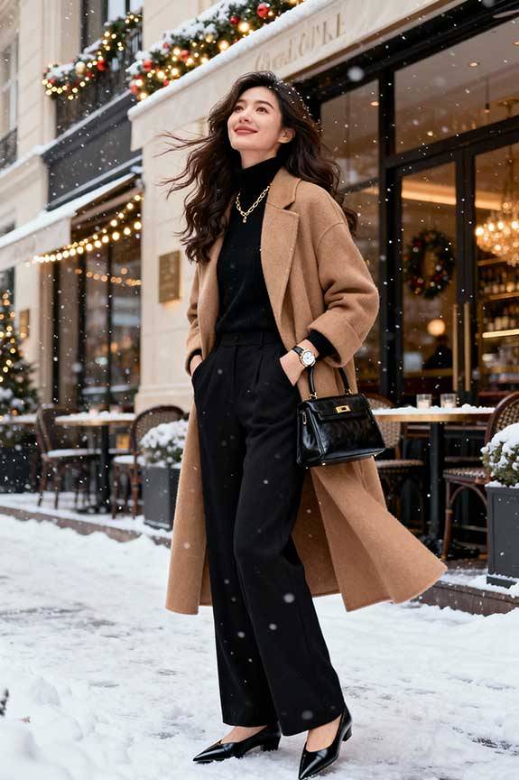 A camel wool coat adds warmth and elegance, while the black turtleneck keeps things simple yet refined. The wide-leg trousers give the outfit a contemporary feel. Great for an upscale holiday event or a festive Christmas dinner.