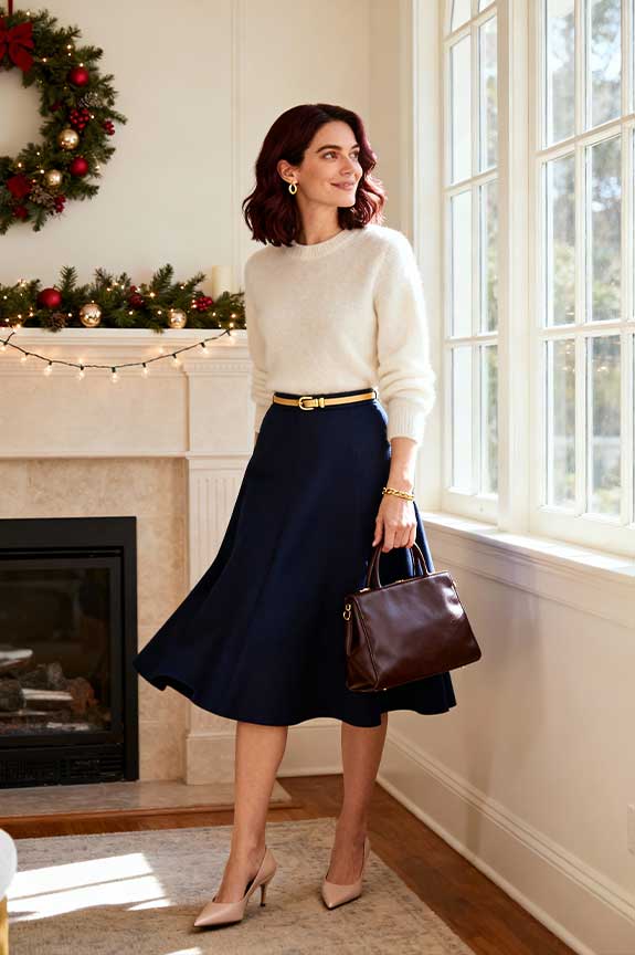 For an effortlessly chic Christmas look, layer a soft cashmere sweater with a navy A-line skirt. A delicate gold belt cinches the waist for definition and adds a hint of glamour without being too bold. Ideal for a cozy holiday gathering or an afternoon tea with family.
