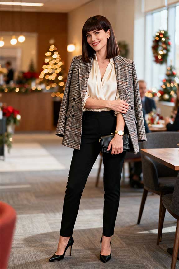 A plaid wool blazer adds texture and sophistication to the outfit, while the silk blouse underneath keeps it light and luxurious. Tailored black pants finish off the look with a professional touch. A perfect option for a holiday office party or a business-casual Christmas gathering.