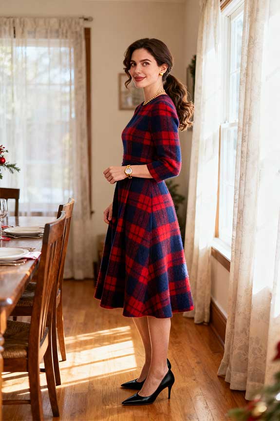 A plaid wool dress offers a festive print without being too bold. Pair it with sleek black pumps for a refined finish that’s still comfortable and practical. Great for a family holiday gathering or a casual Christmas lunch.