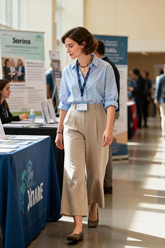 At a career fair, color does a lot of quiet work before you ever speak. Neutrals like navy, charcoal, beige, gray, and soft white tend to photograph well under harsh lighting and read as polished without trying too hard. They also make it easier to mix pieces and repeat outfits across different events.