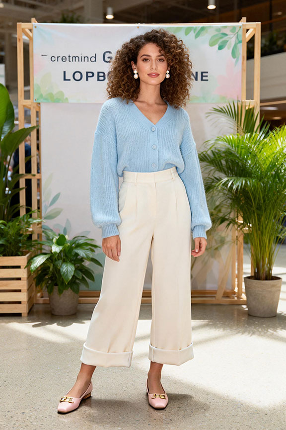 The cropped length works well with high-waist trousers, keeping proportions balanced. The cardigan softens the outfit while still feeling put together. Ballet flats keep the look light and wearable.