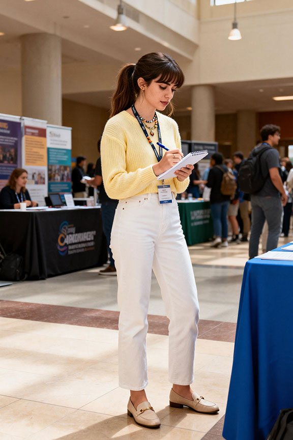 A soft yellow knit brings warmth and approachability to a career fair setting without feeling loud. White straight-leg pants keep the look clean and structured, balancing the softness of the knit. The overall outfit feels fresh, professional, and confident—perfect for making a positive first impression.