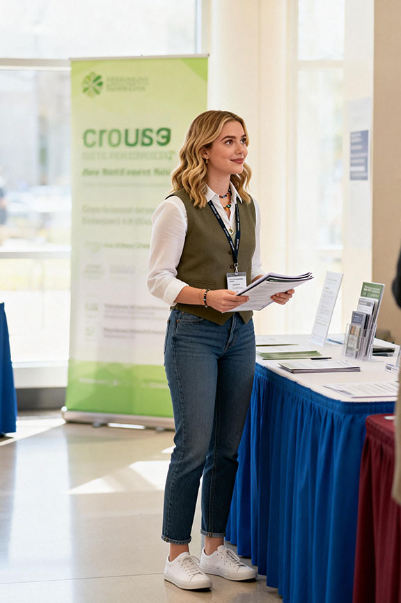 A solid vest layered over a crisp white shirt adds subtle structure without feeling stiff. Paired with classic jeans, the outfit balances professionalism with casual ease—perfect for moving between booths comfortably. White sneakers keep it practical for all-day wear, while maintaining a clean, polished look.