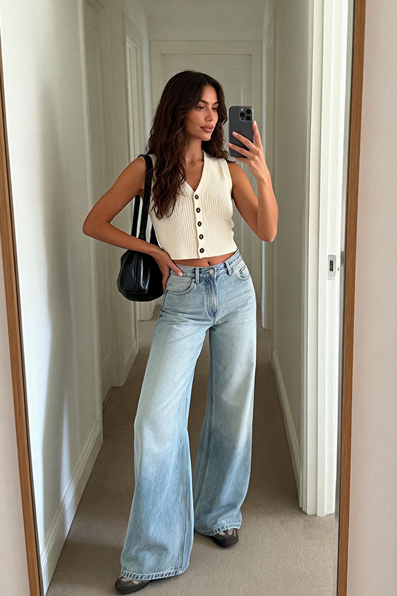 A cream sleeveless knit vest with cropped length brings fitted warmth and subtle structure. Light-wash high-waisted wide-leg jeans create flowing movement and vintage charm naturally. The cropped vest defines the waist while the flowing denim balances proportions for casual spring dates, outdoor dinners, or relaxed evening plans.