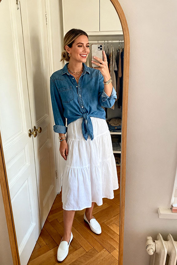 A denim shirt adds structure while staying relaxed and approachable. A midi skirt softens the look for a balanced, date-friendly feel. Loafers keep it grounded and comfortable for extended wear at casual restaurants or wine tastings.