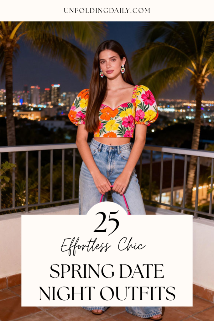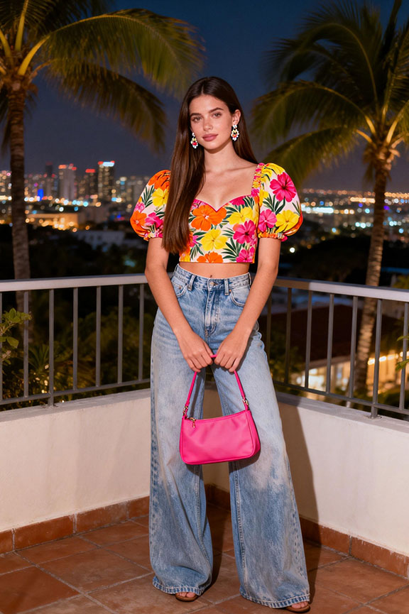 A floral puff-sleeve crop top with sweetheart neckline brings playful vintage charm and bright color. Light-wash high-waisted wide-leg jeans create flowing movement and relaxed proportions naturally. The cropped top defines the waist while the flowing denim balances the look for casual outdoor dates or spring evening plans.