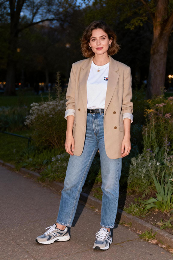 A neutral blazer instantly elevates a simple tee and feels polished. Jeans keep the outfit familiar and relaxed for approachable dates. Sneakers keep it casual and comfortable for spring evenings