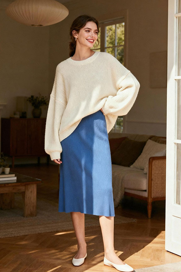An oversized sweater brings cozy warmth while keeping the silhouette relaxed and approachable. A midi skirt balances the volume and adds softness for comfortable movement throughout the evening. Ballet flats keep it grounded and easy for casual dinners, low-key plans, or neighborhood date spots.