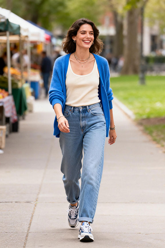 A soft cardigan adds warmth for spring evenings and can be removed easily as temperatures shift. A tank top underneath keeps the outfit light and flexible throughout the date. Relaxed jeans and sneakers make this ideal for walk-and-talk dates or outdoor markets.