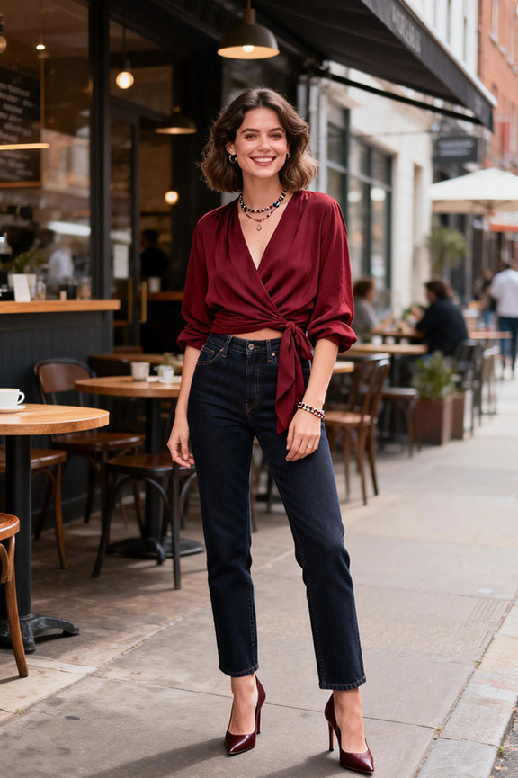 A wrap top adds shape while staying comfortable for seated dinners or standing. Straight jeans keep the outfit relaxed and familiar enough for easy dates. Low heels make it feel date-ready while staying comfortable throughout the evening.
