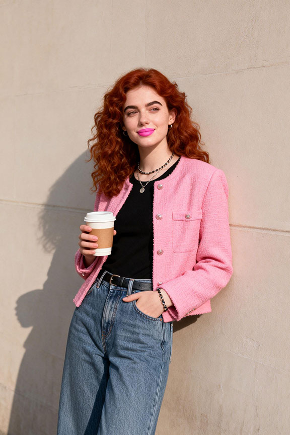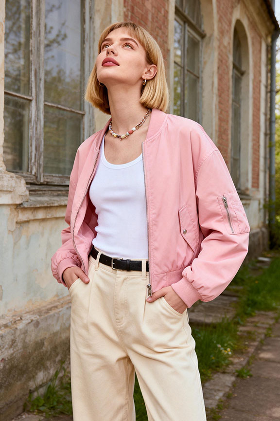 A soft pink jacket adds subtle color without overwhelming the outfit or feeling too bold. Neutral layers underneath keep it polished and wearable for everyday errands, coffee dates, or casual office days.