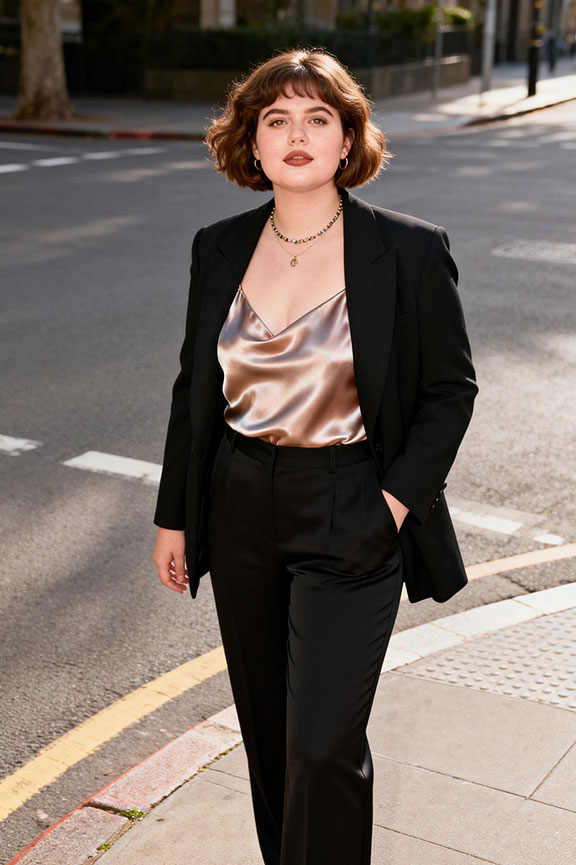 A tailored spring jacket paired with satin feels elevated and refined without much effort. Straight-leg pants keep the outfit polished and wearable for dinners, cocktail events, or special occasions.