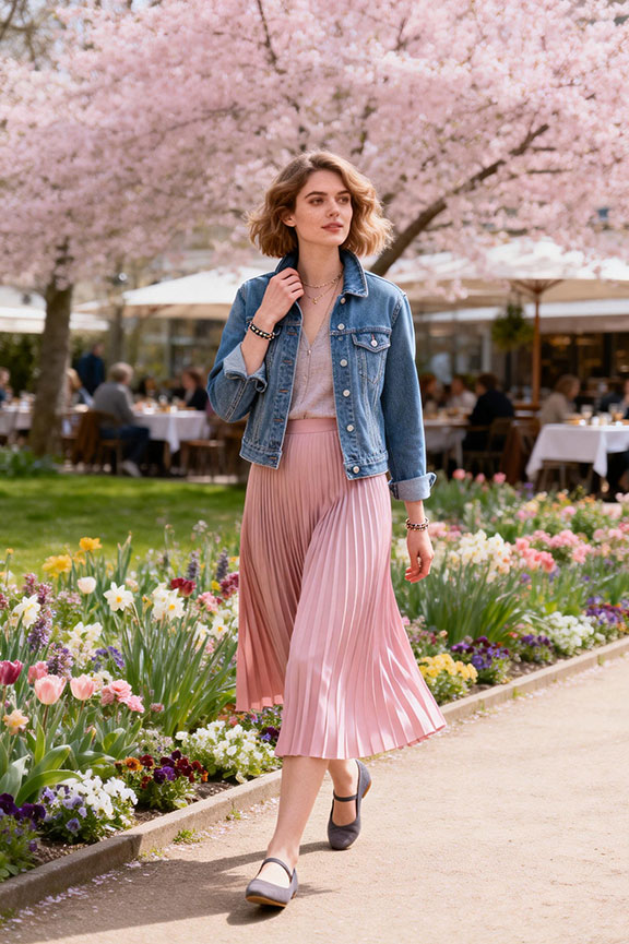 The structured denim contrasts beautifully with a fluid, feminine slip skirt. Ballet flats keep the look soft and wearable throughout the day. An easy choice for casual spring plans, brunches, or daytime outings.
