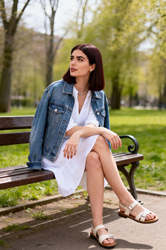 A denim jacket adds structure and weight to an otherwise fluid dress. Flat sandals keep the outfit relaxed and wearable for all-day comfort. Ideal for warm spring days when you still need light layering.