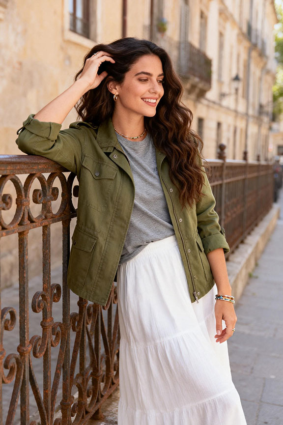 A green jacket adds subtle color while remaining easy to style with basics. A grey tee keeps the base neutral and relaxed, while a white maxi skirt creates flowing contrast. The combination balances structure with movement naturally. Perfect for casual spring outings, weekend plans, or relaxed daytime events.