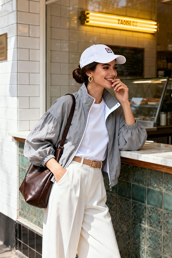 A grey cropped jacket with stand collar brings relaxed structure and effortless polish. Paired with white wide-leg pants, the monochrome palette feels clean and modern. A slim tan belt defines the waist, while a white baseball cap adds casual contrast. Perfect for spring city walks, casual brunches, or minimal weekend styling.