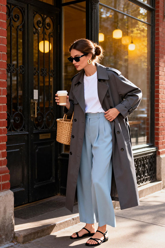 A long grey trench coat creates elegant vertical lines with timeless structure. Paired with a white tee and light blue wide-leg pants, the outfit balances polish with relaxed ease. The flowing silhouette elongates naturally while remaining comfortable for all-day wear. Perfect for spring city outings, casual meetings, or transitional weather days.