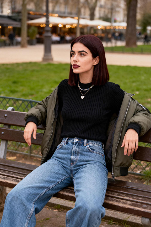 A black spring jacket keeps the look sharp while remaining versatile enough for daily wear. A white tee softens the contrast and creates clean lines, while straight-leg jeans ground the outfit naturally. This is an easy default you’ll return to all season for errands, coffee runs, or casual weekends.