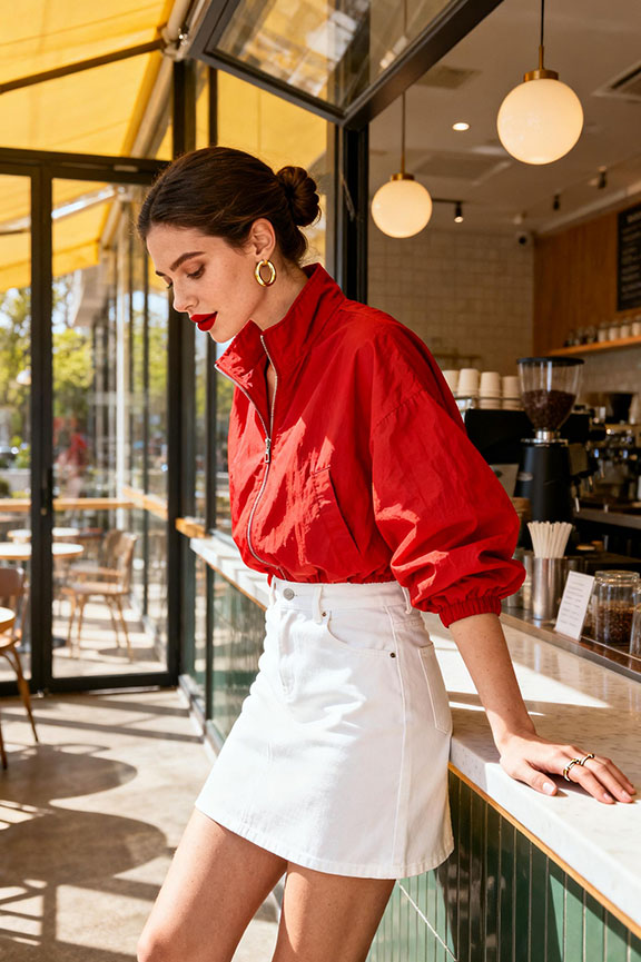 A bright red cropped jacket with stand collar brings bold energy and relaxed structure. Paired with a white high-waisted A-line mini skirt, the color contrast feels fresh and modern. The oversized silhouette balances the shorter skirt naturally, while gold hoop earrings add subtle polish. Perfect for spring brunches, casual city outings, or days when you want statement color.