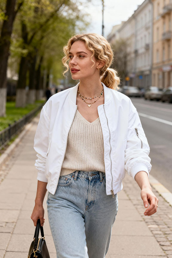 A white jacket instantly brightens your outfit and feels seasonally appropriate. Neutral tones underneath keep it from feeling too sharp or stark, while light denim maintains casual balance. Great for daytime outings or weekend brunches.