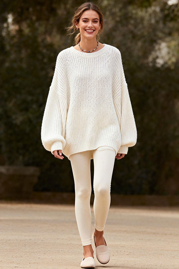 Soft knits add texture without heaviness, making leggings feel more intentional. Flats keep the outfit refined yet casual. The slightly fitted silhouette ensures the leggings don’t disappear under layers.