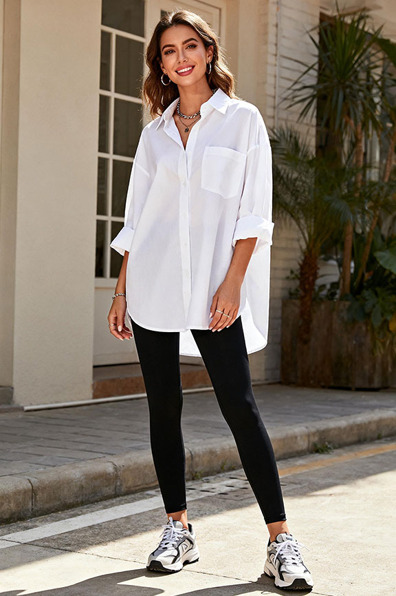 A longer white shirt balances slim leggings and keeps the outfit from feeling too casual. Keeping the shirt crisp gives structure, while sneakers make it practical for walking or errands. Simple proportions make it easy to repeat throughout the season.