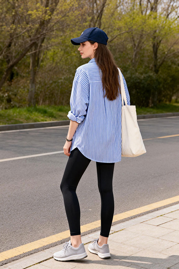 The striped oversized shirt adds visual interest and a relaxed spring vibe while balancing the slim black leggings. High-waist yoga pants keep proportions clean and provide comfort for daily wear. Light gray sneakers and a baseball cap make the outfit casual and practical for errands or weekend walks. The off-white canvas tote completes the look with a functional, effortless touch.