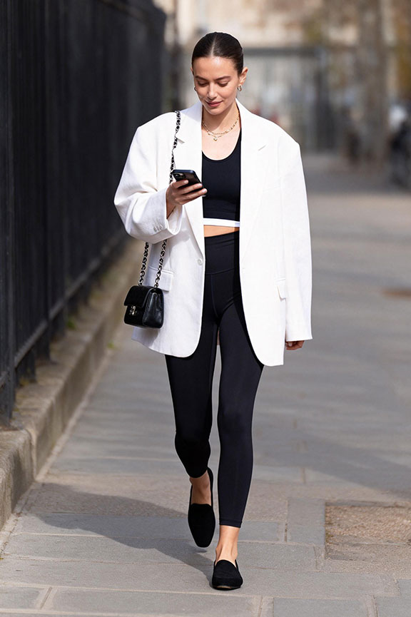 The oversized white blazer adds structure and contrast to the fitted black layers underneath, keeping leggings from feeling too casual. Legging maintain a streamlined silhouette and balance the blazer’s volume. Minimalist flats and a small chain bag keep the outfit practical yet refined. This combination works for errands, casual meetings, or coffee outings while staying comfortable and polished.