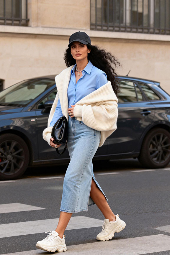 This outfit strikes a balance between casual and sporty. The black baseball cap adds a cool, laid-back vibe, while the light blue shirt and off-white cardigan provide a fresh and soft base. The slit denim skirt adds a touch of femininity and mobility, while white sneakers ground the look with comfort and style. Ideal for a casual day out or a weekend brunch, this outfit keeps things effortless yet put-together.
