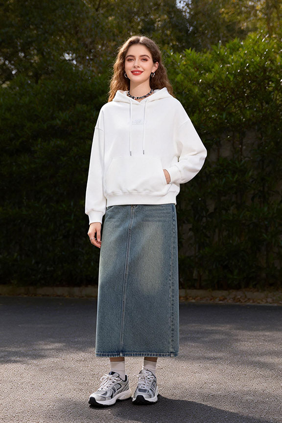 The hoodie creates a relaxed, casual vibe while the long skirt keeps the outfit grounded and wearable. Sneakers make walking comfortable without compromising style. Great for errands, travel, or weekend activities—you’ll pull it out multiple times in spring.