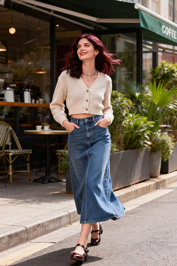 A cropped cardigan highlights the waist and balances the skirt’s length. Mary Janes add a subtle vintage feel. This works well for coffee dates or relaxed afternoons.